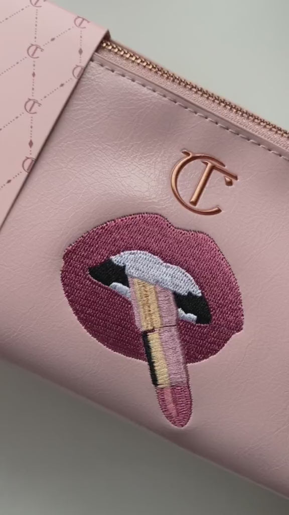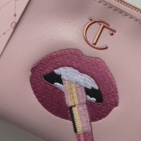 La bolsa de cosméticos Charlotte Tilbury Pillow Talk es una bolsa de cosméticos espaciosa y con cremallera de edición limitada con un par de labios bordados y un lápiz labial.